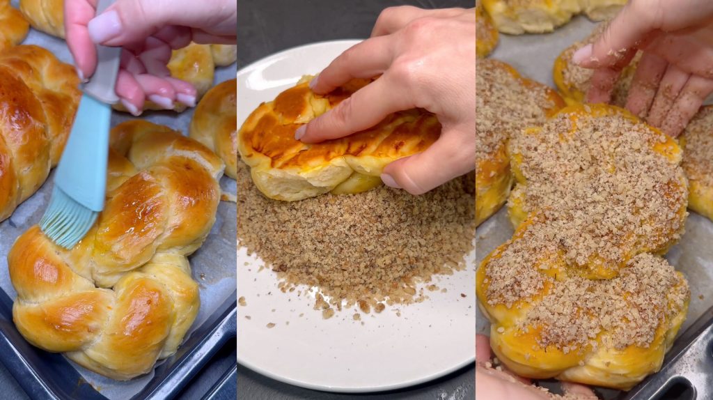 Hoy preparamos la versión al horno, suave tipo pan brioche, empapada en almíbar, pincelada con miel y cubierta de nueces picadas.