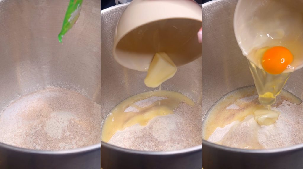 En un bol ponemos la harina, el azúcar, la levadura desmenuzada, la mantequilla blanda, los huevos,