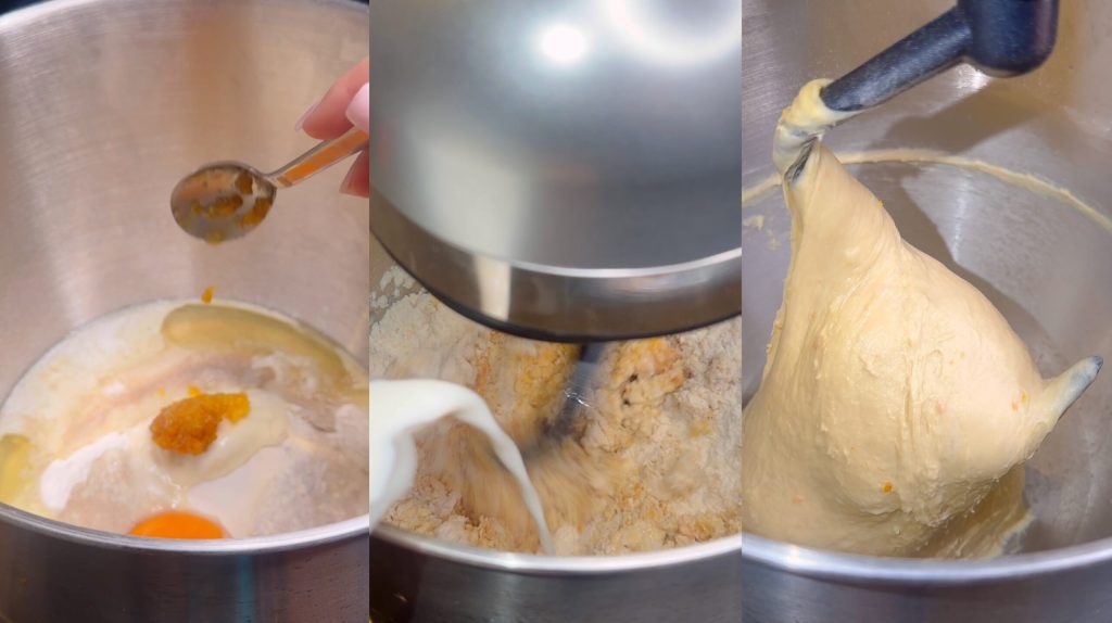 añadimos la ralladura de naranja y empezamos a amasar añadiendo la leche poco a poco.