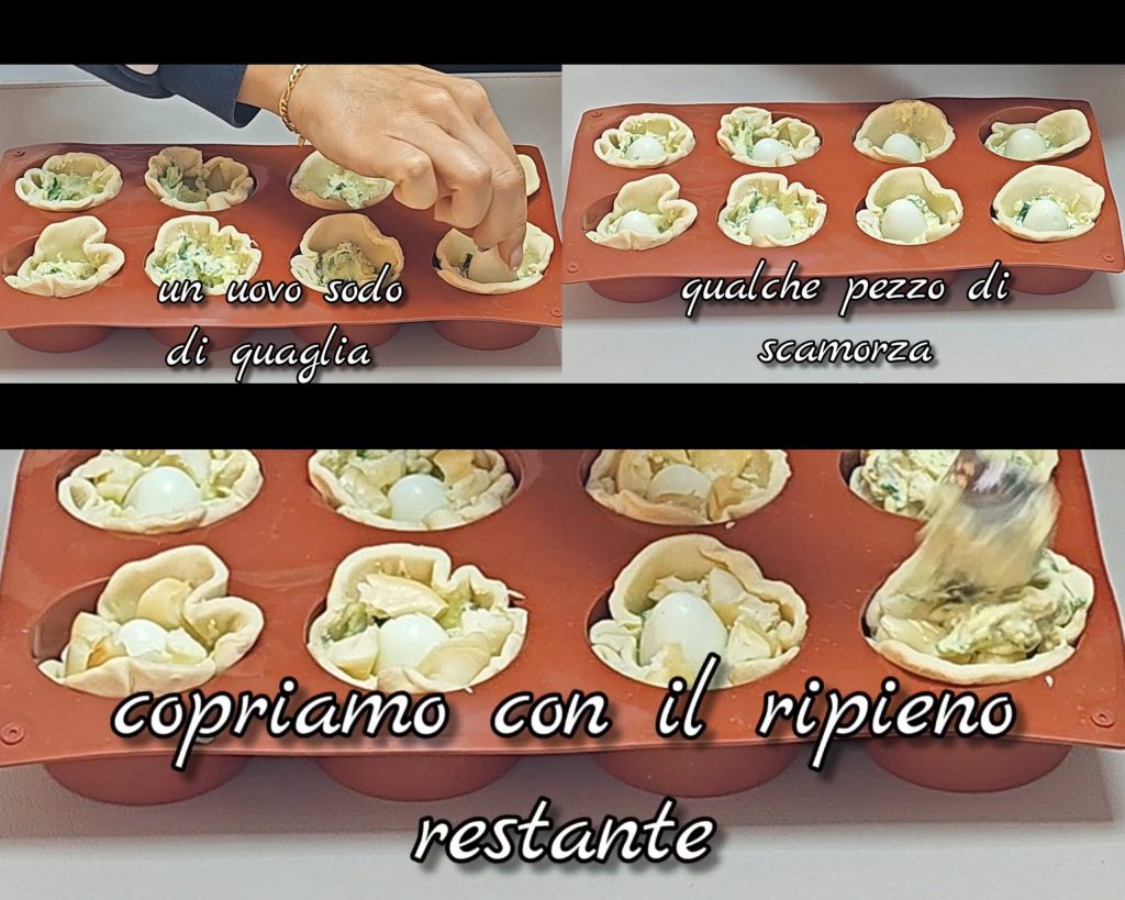 Añadimos en el centro un huevo de codorniz cocido y unos cubitos de scamorza.