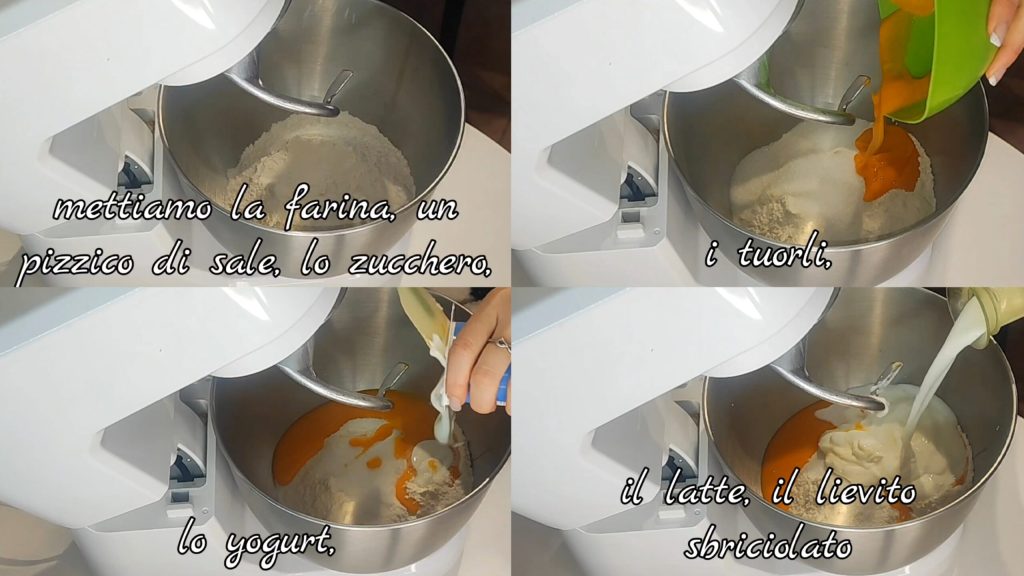 Ponemos la harina, una pizca de sal, el azúcar, las yemas, el yogur, la leche, la levadura desmenuzada.