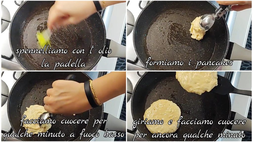 Pincelamos con aceite la sartén, calentamos bien y ponemos la mezcla formando los pancakes con una cuchara. Cocinamos durante unos minutos a fuego lento, luego los damos la vuelta y cocinamos durante unos minutos más.