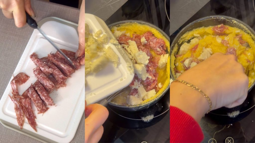 • Cuando la polenta se haya espesado, añade embutidos y quesos cortados en trocitos (puedes usar lo que prefieras: speck, jamón, salami, scamorza, fontina…). Remueve bien hasta distribuirlos uniformemente.