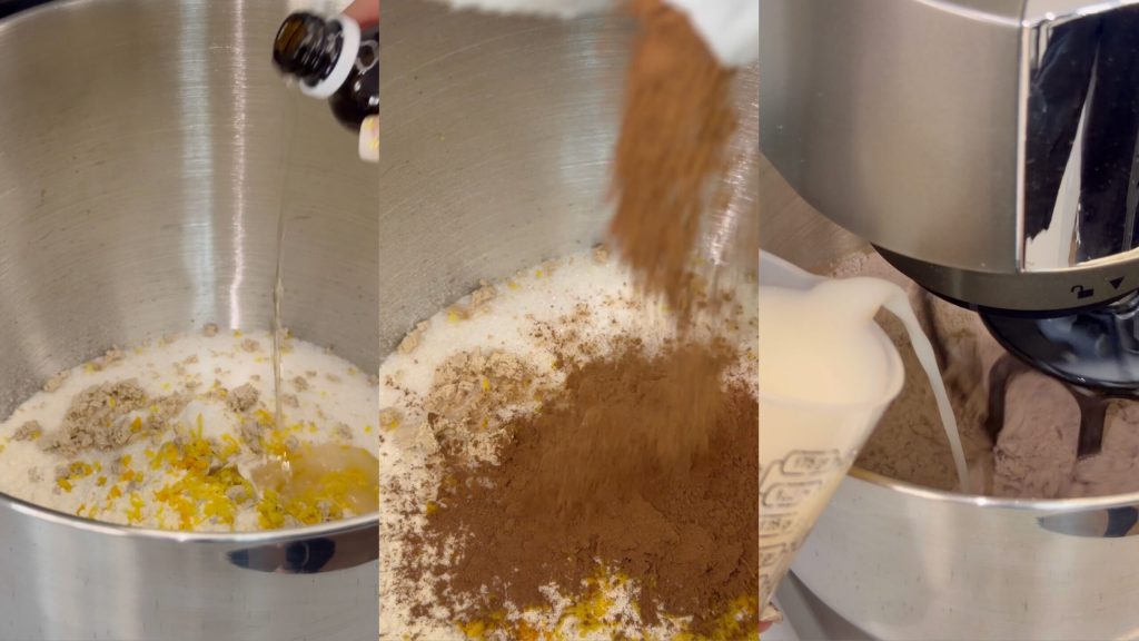 • Añadimos el aroma de vainilla, y el aroma de ron, el cacao, la leche vegetal y amasamos durante unos 10 minutos, hasta obtener una mezcla bien homogénea