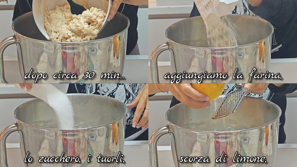 Después de 30 minutos, añade a la masa obtenida la harina, el azúcar, las yemas, la cáscara de limón
