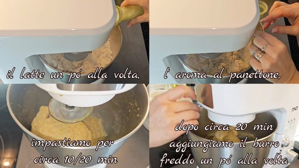 • Ponemos la leche poco a poco, la esencia de panettone y amasamos durante unos 10/20 min. Después de unos 20 min añadimos la mantequilla fría poco a poco y continuamos amasando.