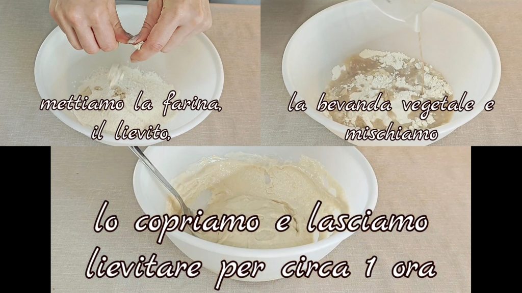 En un recipiente ponemos la harina, la levadura, la leche vegetal y mezclamos. Lo cubrimos y dejamos reposar durante aproximadamente una hora.
