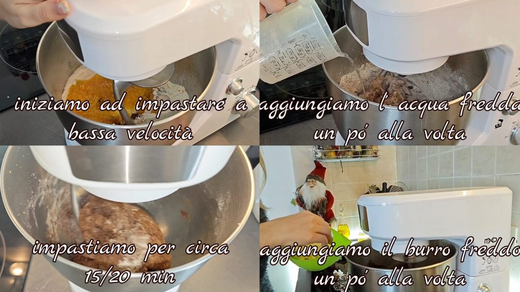 • empezamos a amasar a baja velocidad. Añadimos el agua fría poco a poco y amasamos durante unos 10/15 min. Añadimos la mantequilla fría poco a poco