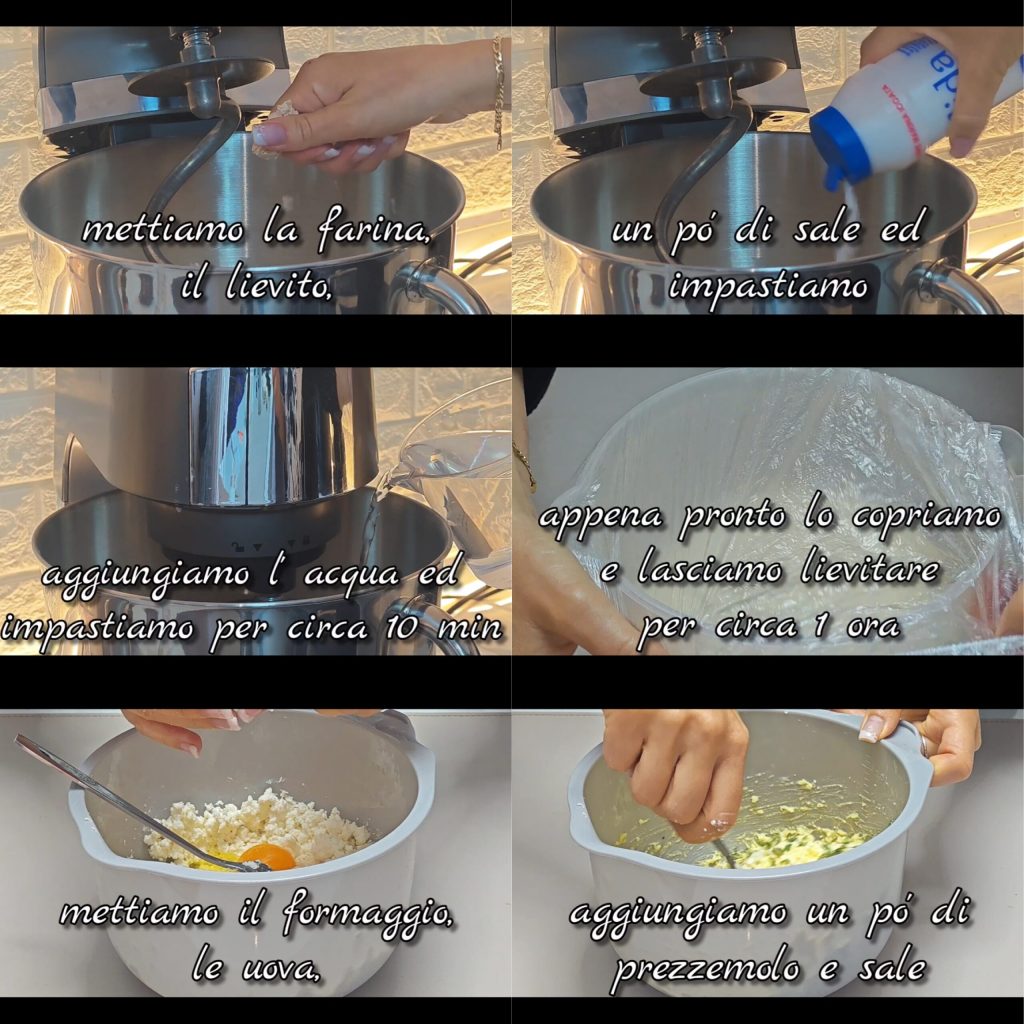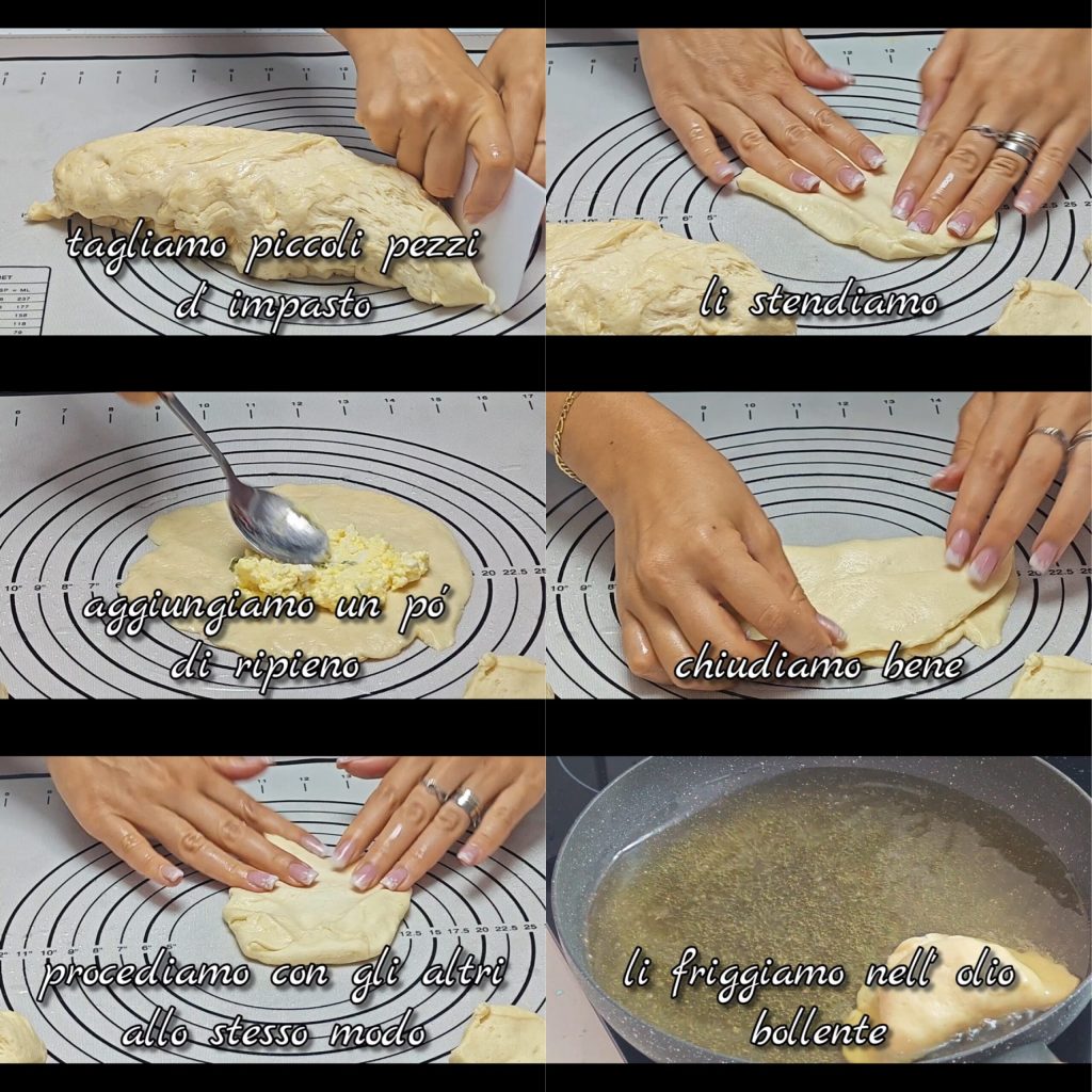 Después de aproximadamente una hora, cogemos la masa y la cortamos en pequeños trozos. Extendemos un trozo a la vez y añadimos un poco de relleno en cada uno, luego los cerramos para obtener los paquetitos. Una vez listos, los freímos en aceite caliente.