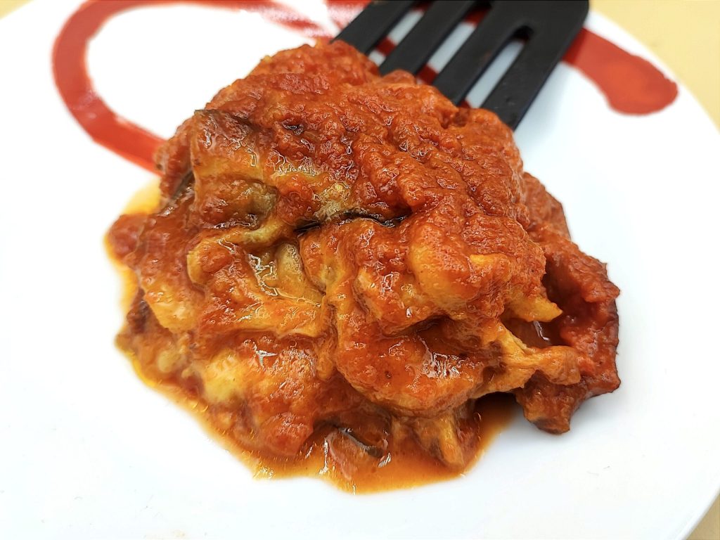 mezclamos de vez en cuando. Mientras tanto cortamos las berenjenas en rodajas finas y luego las freímos en aceite caliente durante unos minutos. Las ponemos a escurrir sobre papel absorbente.