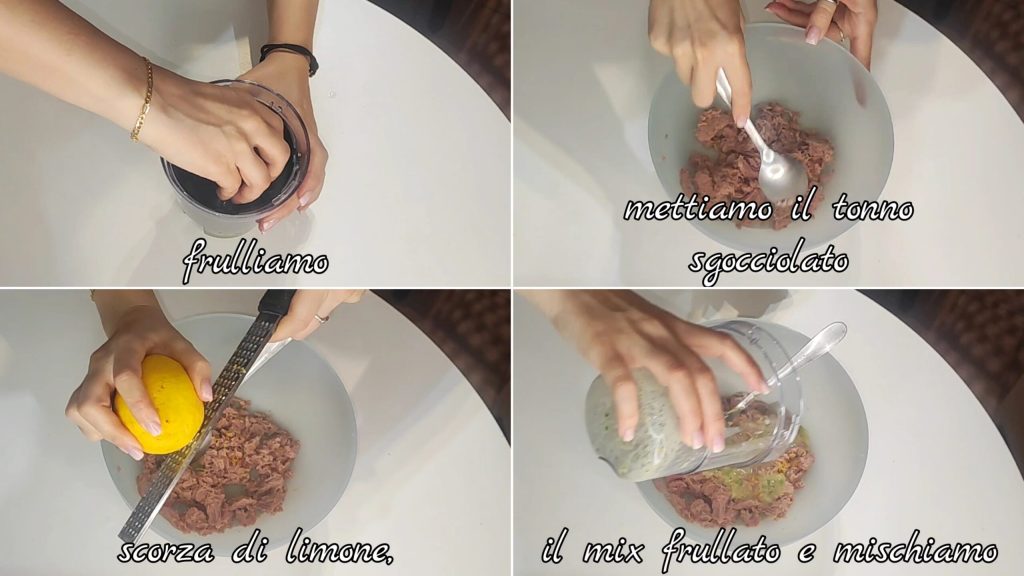 Lo trituramos. En un recipiente ponemos el atún escurrido, la ralladura de limón, la mezcla triturada y lo mezclamos.