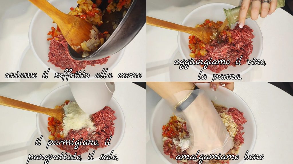 Unimos el sofrito a la carne picada. Añadimos el vino, la nata, el parmigiano, el pan rallado, la sal y mezclamos bien.