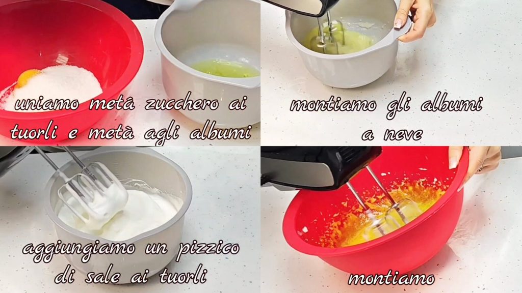 Unimos la mitad del azúcar con las yemas y la otra mitad con las claras. Montamos las claras a punto de nieve. Añadimos una pizca de sal a las yemas y montamos.