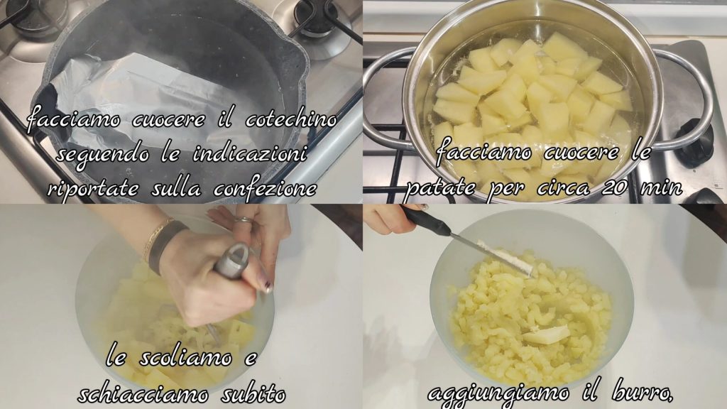 Primero cocemos el cotechino en agua hirviendo siguiendo las instrucciones del paquete. Mientras tanto, también hervimos las patatas durante unos 20 minutos, luego las escurrimos y las machacamos de inmediato. Añadimos la mantequilla.