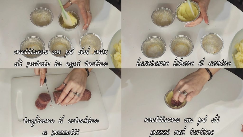 Ponemos un poco de la mezcla de patatas en cada uno dejando el centro libre. Cortamos el cotechino en trozos y ponemos algunos en los pastelitos.