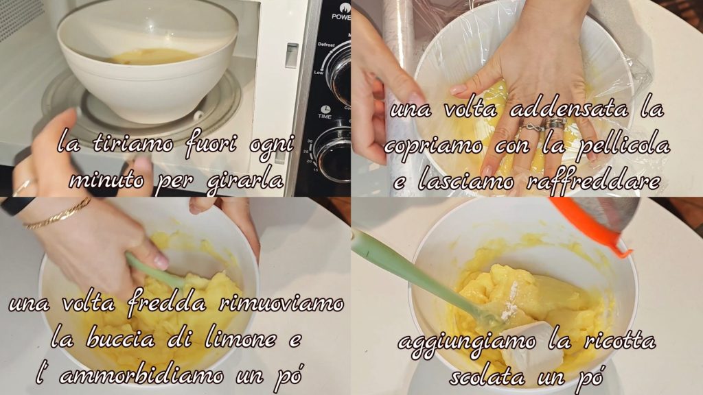 La sacamos cada minuto para removerla. Una vez espesada, cubrimos con el film y dejamos enfriar. Una vez enfriada, retiramos la cáscara de limón y la suavizamos un poco mezclando. Añadimos la ricotta escurrida.