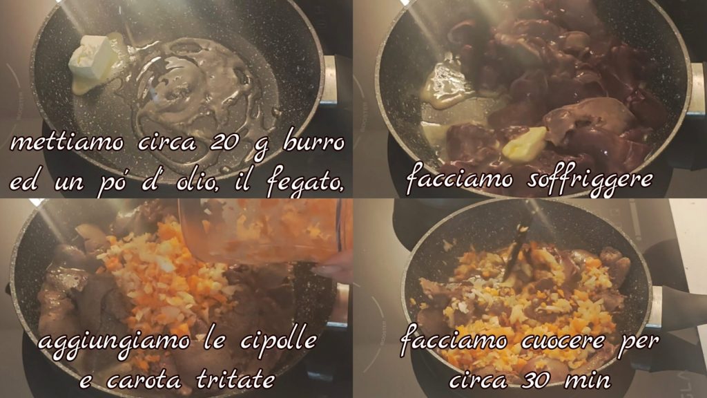En una cacerola ponemos unos 20 g de mantequilla, un poco de aceite, el hígado y lo sofreímos. Añadimos las cebollas y la zanahoria picadas y dejamos cocinar durante unos 30 minutos.
