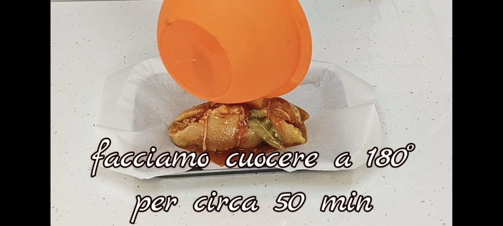 • Cubrir y poner en la nevera hasta el día siguiente. Al día siguiente, tomamos la pechuga de pollo y la atamos con cuerda. Colocamos la pechuga de pollo en una bandeja con papel de horno dentro. También añadimos el jugo por encima.