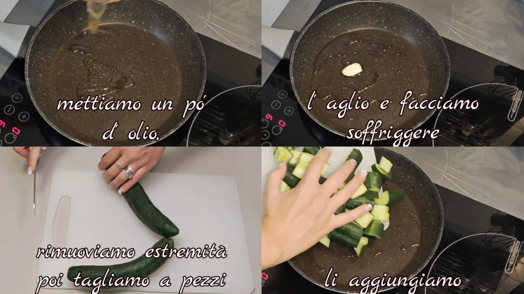 En una sartén ponemos un poco de aceite, ajo y lo sofreímos. Mientras tanto, limpiamos y cortamos los pepinos y los añadimos al sofrito.