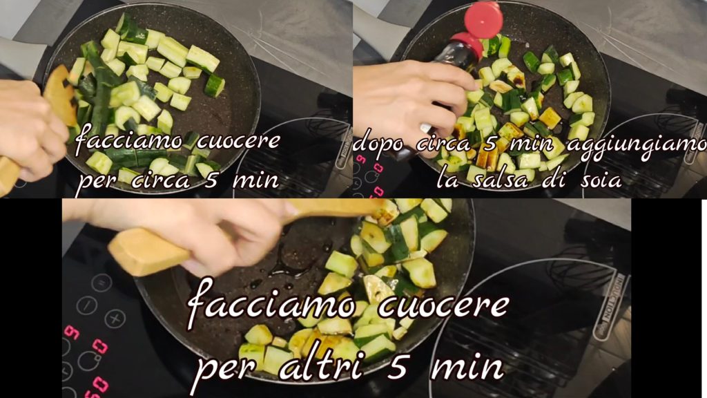 Cocinamos durante unos 5 minutos. Después de unos 5 minutos, añadimos la salsa de soja y cocinamos por otros 5 minutos aproximadamente. ¡Mezclamos de vez en cuando!