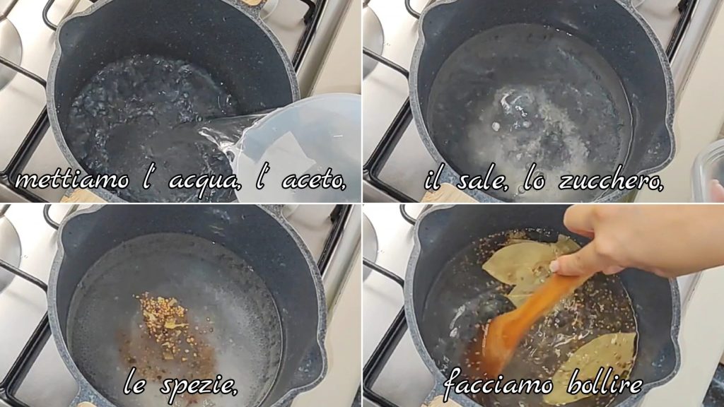 Primero, ponemos en una cacerola el agua, el vinagre, la sal, el azúcar, las especias y llevamos a ebullición.
