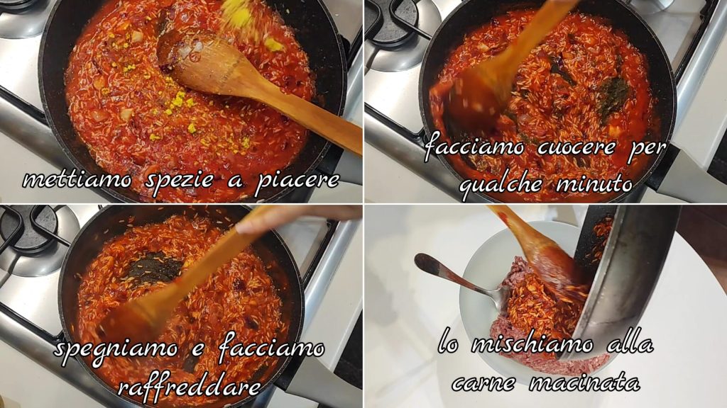 Añadimos especias al gusto y dejamos cocinar por unos minutos. Apagamos y dejamos enfriar, luego mezclamos con la carne picada y amalgamamos bien.