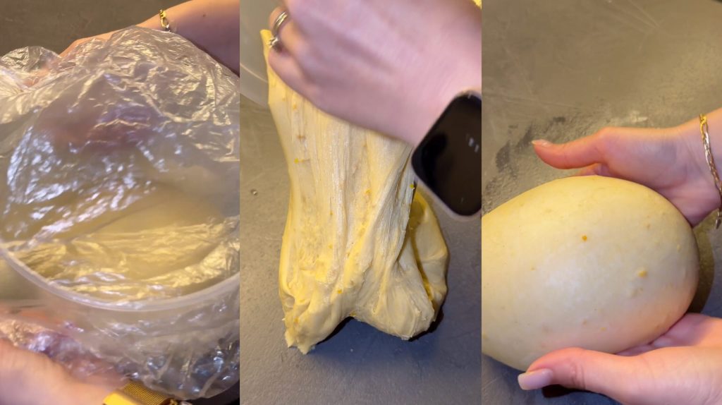 Trabajo la masa durante unos 10-15 minutos, hasta obtener una mezcla elástica que se despega de las paredes del bol.