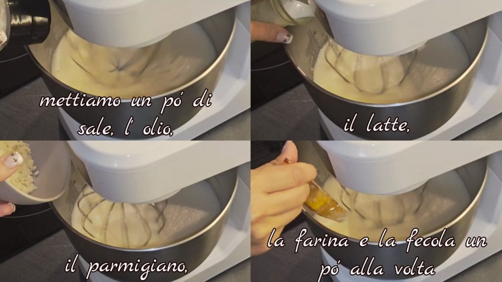Añadimos el aceite, la leche, el parmesano, la harina y la fécula poco a poco.