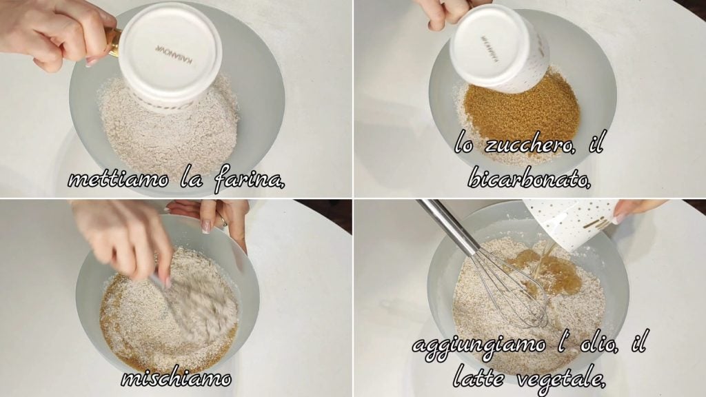 En un recipiente ponemos la harina, el azúcar, el bicarbonato y mezclamos. Añadimos el aceite, la leche.