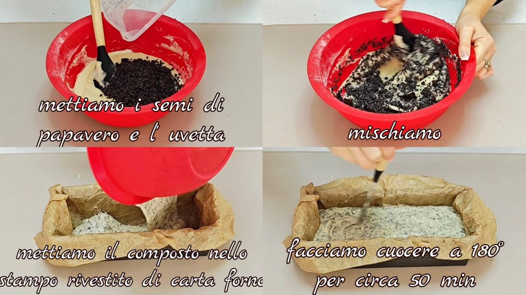 Finalmente pon las semillas de amapola y las pasas. Transfiere la mezcla obtenida a un molde de plumcake (11×26 cm) revestido con papel de horno. Cocina a 180º por unos 50 minutos.