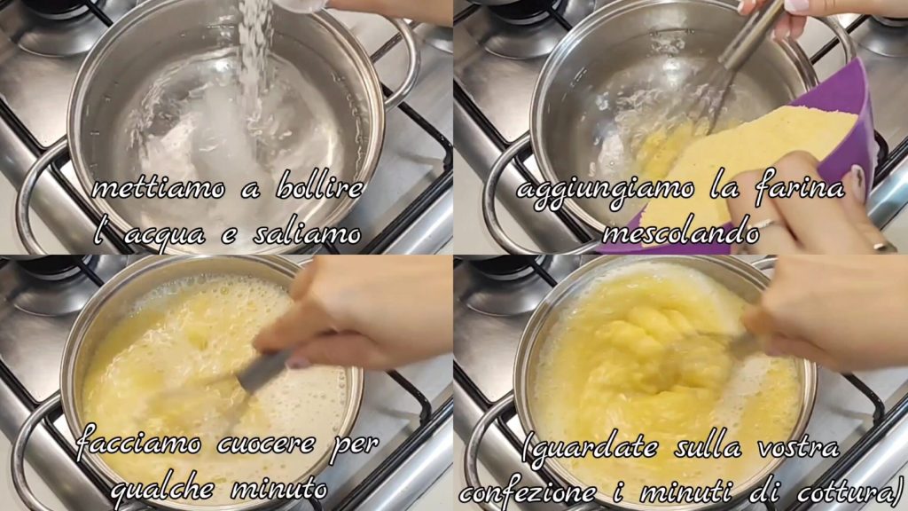 Primero preparamos la polenta. En un recipiente ponemos el agua a hervir y añadimos sal. Agregamos la harina poco a poco mezclando con el batidor. Cocinamos durante unos minutos (mira en tu paquete el tiempo de cocción).