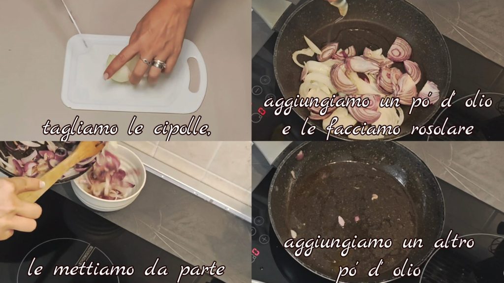 Corta la cebolla y sofríela en la sartén con un poco de aceite de oliva virgen extra, cuando estén listas, las sacamos y reservamos. En la misma sartén añade un poco más de aceite
