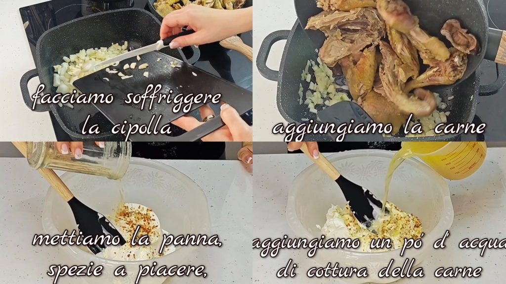 Mientras tanto, sofreímos la cebolla con un poco de aceite y luego añadimos la carne. En un recipiente ponemos la nata, especias al gusto y un vaso de agua de la cocción de la carne y mezclamos.