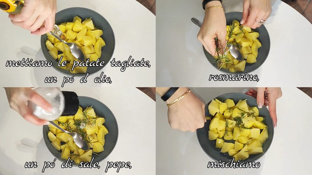 Primero limpiamos, lavamos y cortamos las patatas y el pollo. Colocamos en un recipiente las patatas, un chorrito de aceite, romero, sal y pimienta y mezclamos bien.