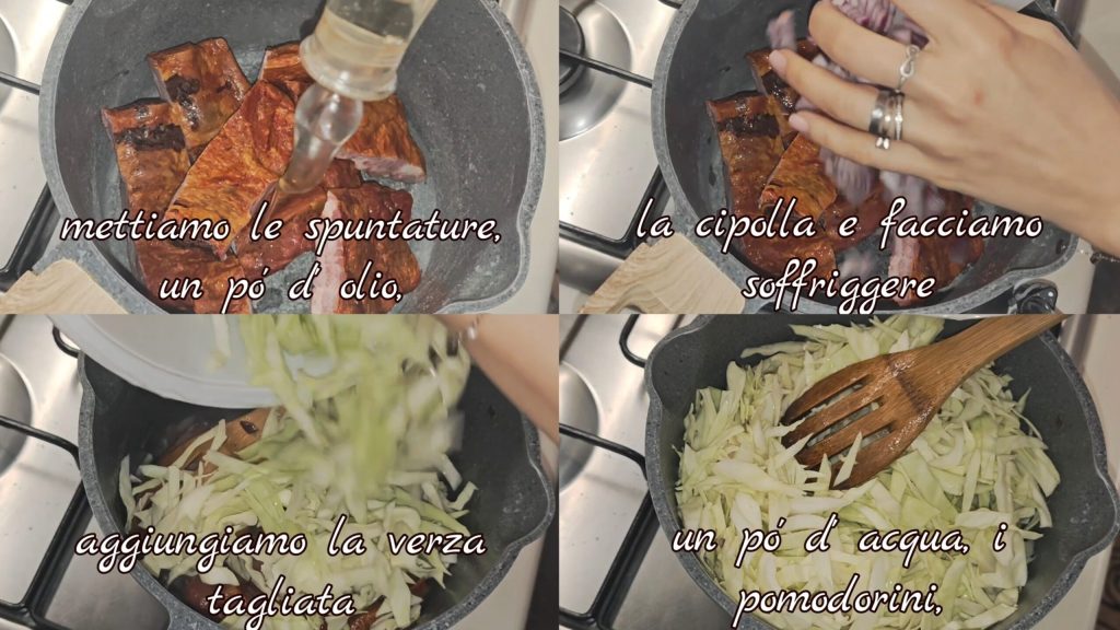 Ponemos las costillas, un poco de aceite, la cebolla y sofreímos. Agregamos el repollo lavado, limpio y cortado, un poco de agua, los tomatitos,