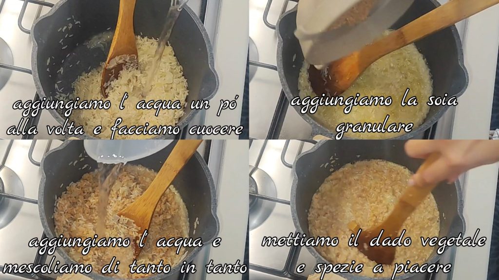 • Añadimos el agua poco a poco y cocinamos removiendo de vez en cuando. Añadimos la soja granulada (mirad los tiempos de cocción en vuestro paquete para saber cuándo añadirla). Ponemos la pastilla de caldo vegetal y especias al gusto.