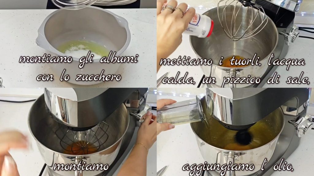 Primero separamos las claras de las yemas. Empezamos a montar las claras a punto de nieve con el azúcar. Ponemos un pellizco de sal en las yemas, el agua caliente y batimos. Añadimos el aceite,