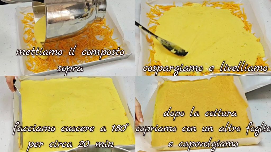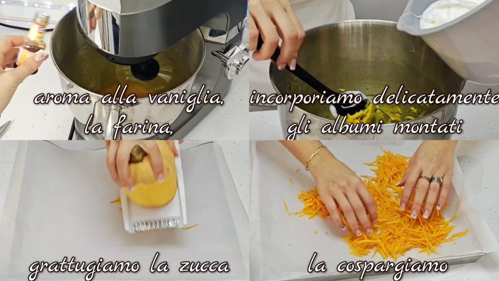 Añadimos un poco de aroma de vainilla, la harina y mezclamos bien. Incorporamos delicadamente las claras montadas. Rallamos la calabaza directamente en la bandeja forrada con papel de horno y luego la esparcimos.