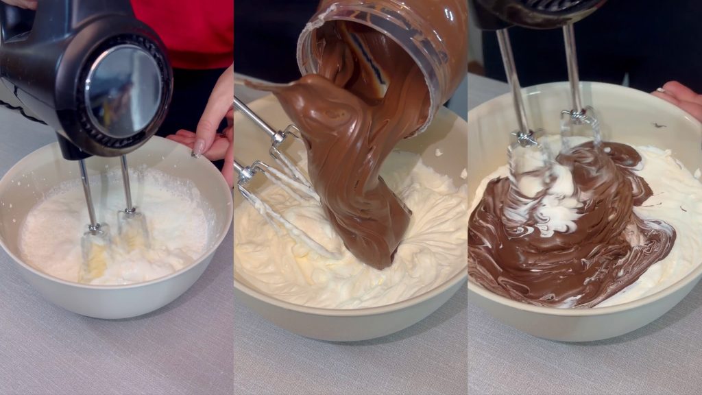 • Monta hasta obtener una crema firme y aterciopelada. Añade la Nutella y mezcla bien hasta obtener una crema lisa y homogénea.