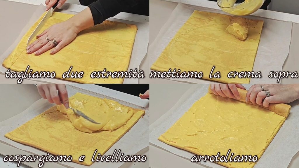 cortamos los dos extremos. Ponemos la crema encima, espolvoreamos y nivelamos. Enrollamos