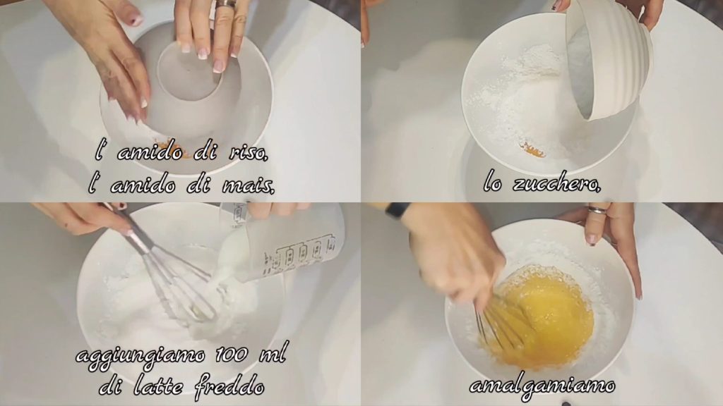 Añadimos el almidón de arroz, el almidón de maíz, el azúcar y mezclamos. Añadimos 100 ml de leche fría y mezclamos.