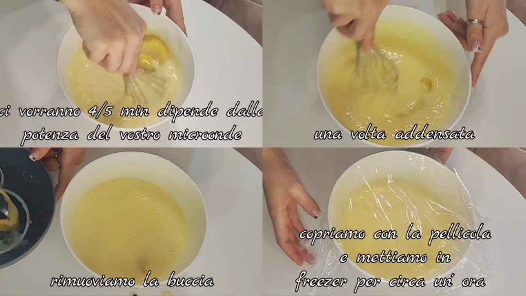 Mientras tanto, calentamos bien la leche restante con la cáscara de limón dentro y luego la añadimos mezclando. La ponemos en el microondas hasta que se espese, la sacamos cada minuto para removerla.