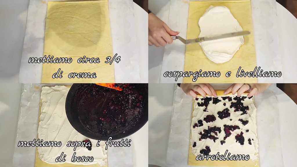 Ponemos encima aproximadamente 3/4 de la crema preparada, esparcimos y nivelamos. Añadimos los frutos del bosque y enrollamos.
