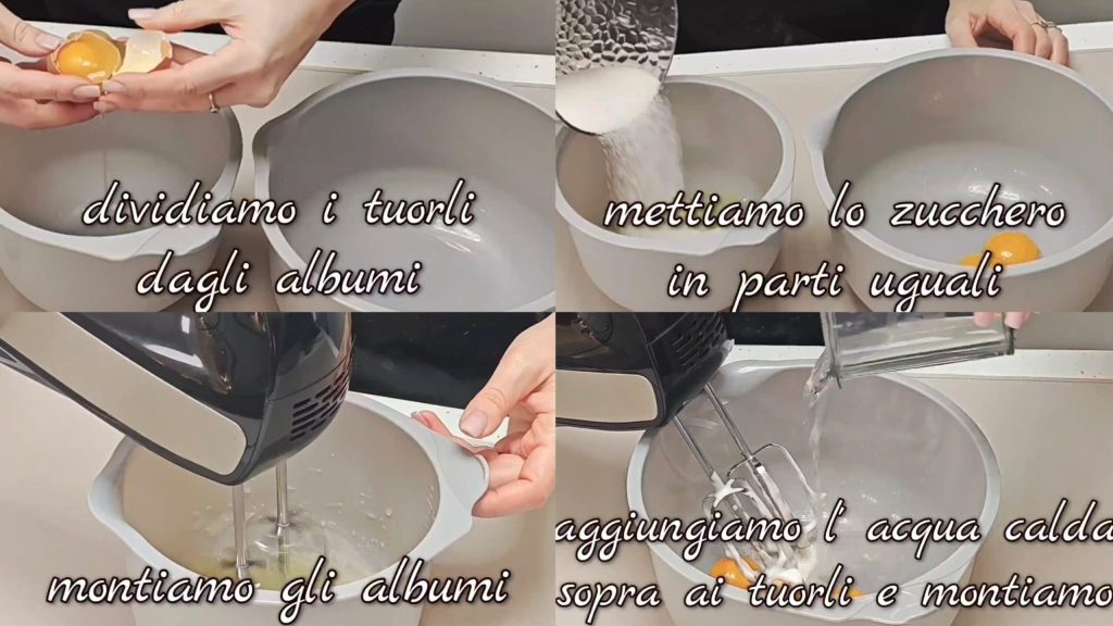 Primero separamos las yemas de las claras. Añadimos el azúcar en partes iguales. Empezamos a montar las claras usando las varillas eléctricas. Añadimos el agua caliente sobre las yemas y empezamos a montar.