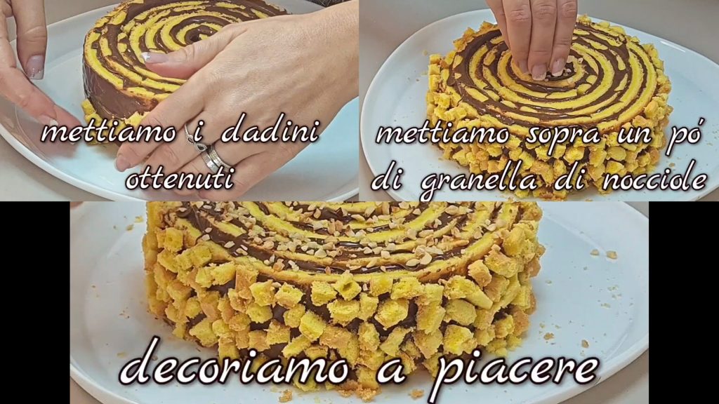 la ponemos en el centro del plato. Ponemos las otras tiras alrededor para obtener el rollo. Cortamos en daditos los recortes del borde. Cubrimos el borde del rollo con la Nutella