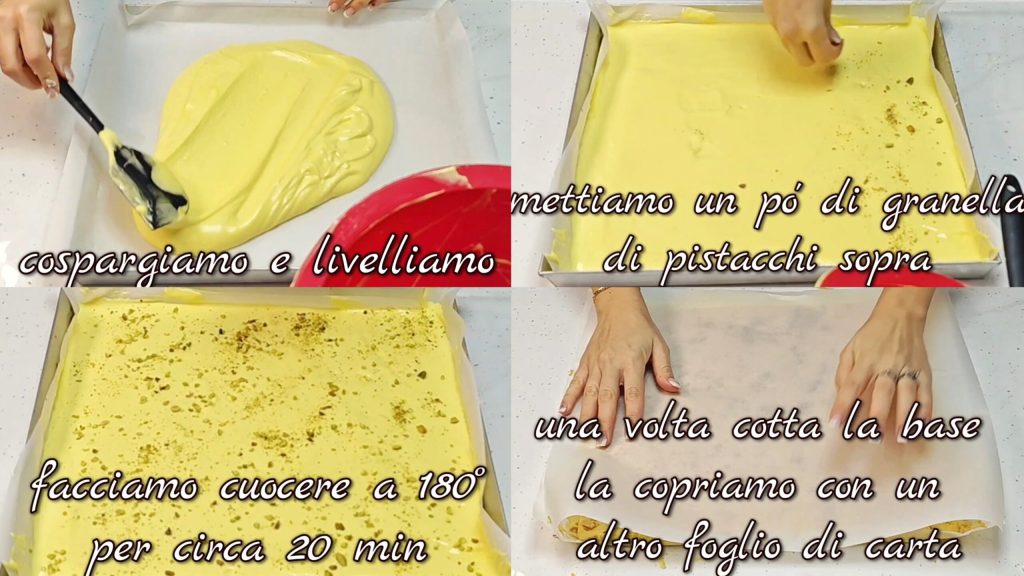 la esparcimos y nivelamos. Añadimos un poco de granillo de pistachos por encima y horneamos a 180° durante unos 20 minutos. Una vez cocida la base, la cubrimos con otra hoja de papel de horno
