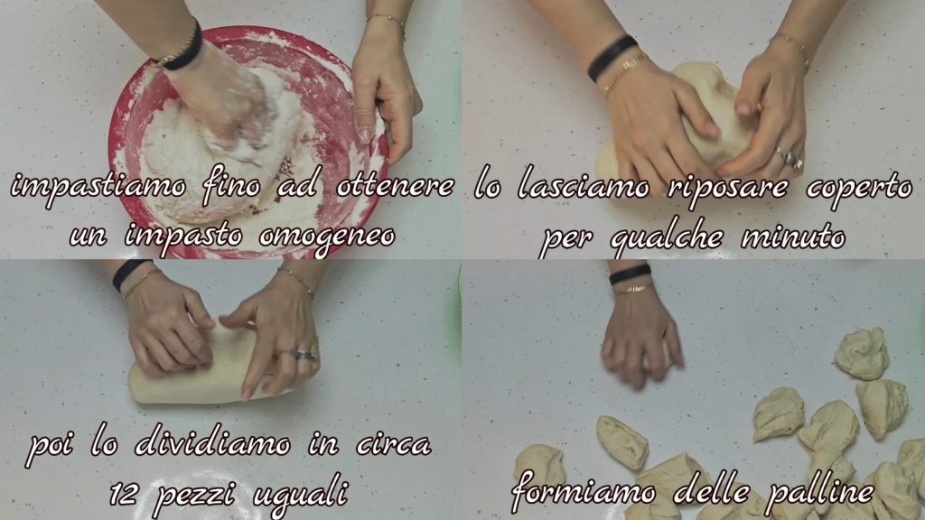 Amasamos hasta obtener una masa homogénea. La dejamos reposar cubierta por unos minutos, la dividimos en 12 partes iguales y formamos bolitas.