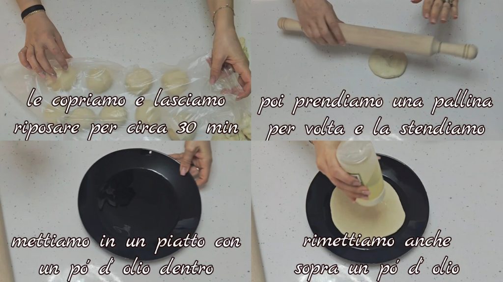 Las cubrimos y dejamos reposar durante unos 30 minutos. Después del reposo, cogemos una bolita a la vez y la estiramos. Tomamos un plato con un poco de aceite y lo ponemos dentro, añadimos más aceite por encima
