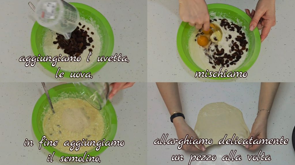Añadimos las pasas, los huevos y mezclamos. Al final añadimos la sémola.