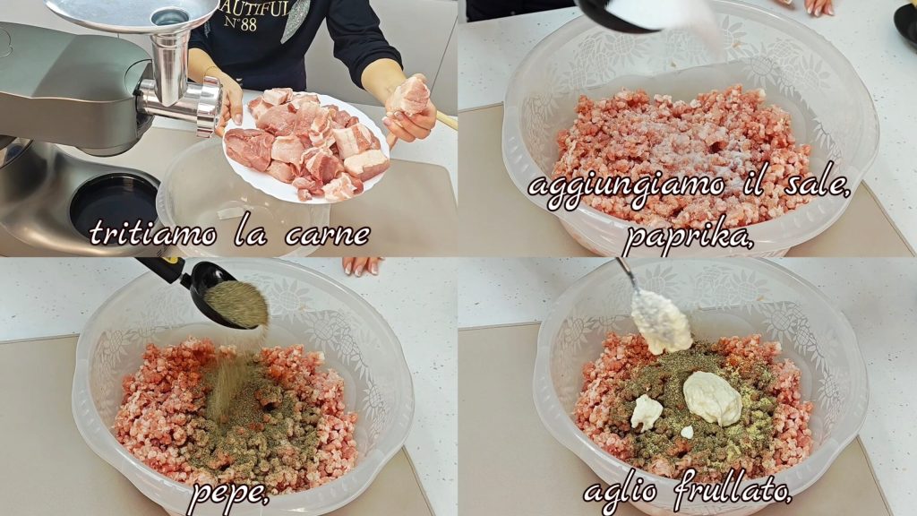 Después de haber elegido cuidadosamente la carne (debe ser 60/70% magra y 30/40% grasa) la picamos. Añadimos los condimentos: sal, pimienta, pimentón, el ajo (yo lo he triturado para evitar encontrar trocitos).